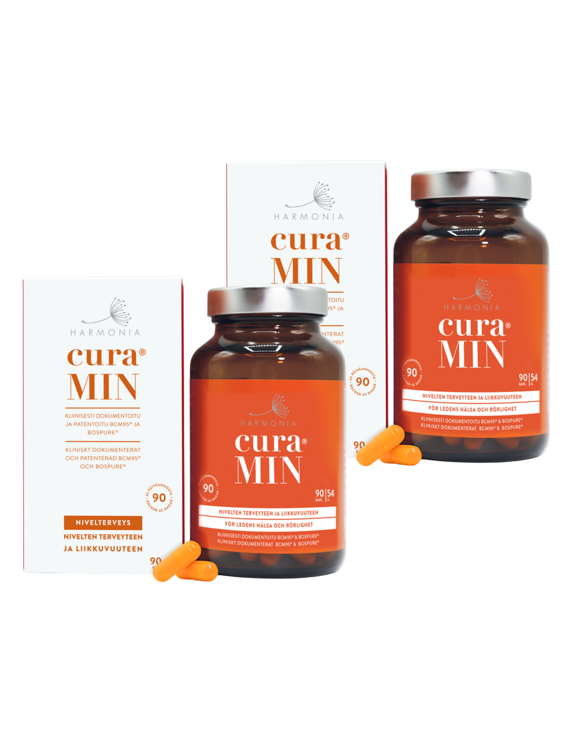 Harmonia curaMIN auttaa suojaamaan niveliä ja tukemaan normaalia nivelterveyttä sekä nivelten liikkuvuutta ja mukavuutta. Kurkumiinia ja boswelliaa sisältävä Harmonia curaMIN kaps 90 kpl kapseli sisältää kahta toisiaan tukevaa uutetta BCM95® kurkumiini- ja BosPure® boswelliauutetta. Kurkumiini tukee nivelten normaalia terveyttä ja suojaa soluja hapettumisstressiltä. Boswellia tukee nivelten liikkuvuutta. Ravintolisä.