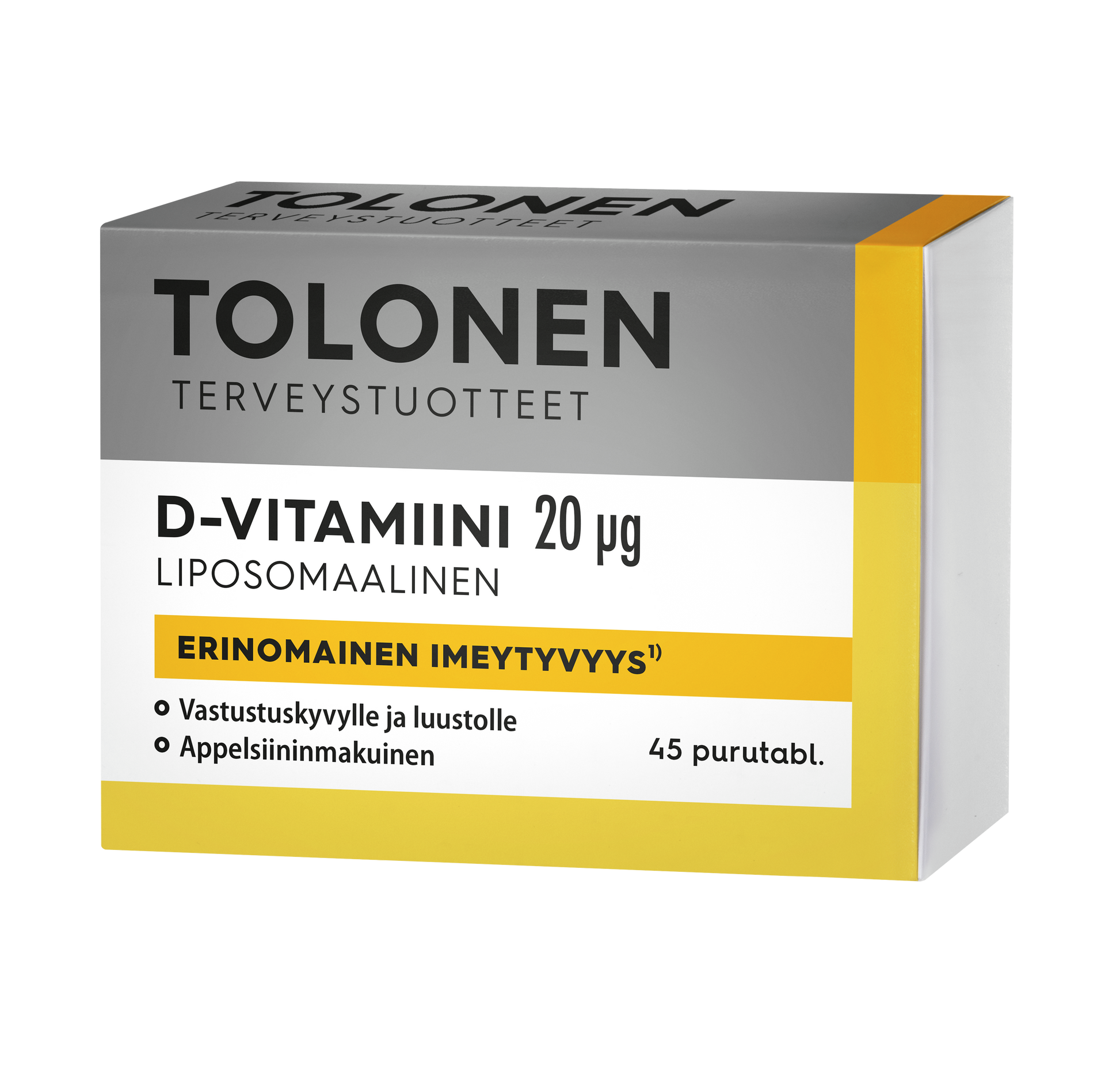 Appelsiininmakuinen purutabletti,Suomessa kehitetyn ja valmistetun Tolonen Liposomaalisen D-vitamiinin sisältämä innovatiivinen Liposovit®-D3-vitamiini takaa tehokkaan imeytymisen ja suuremman hyödynnettävyyden jo 20 µg:n annostuksella.