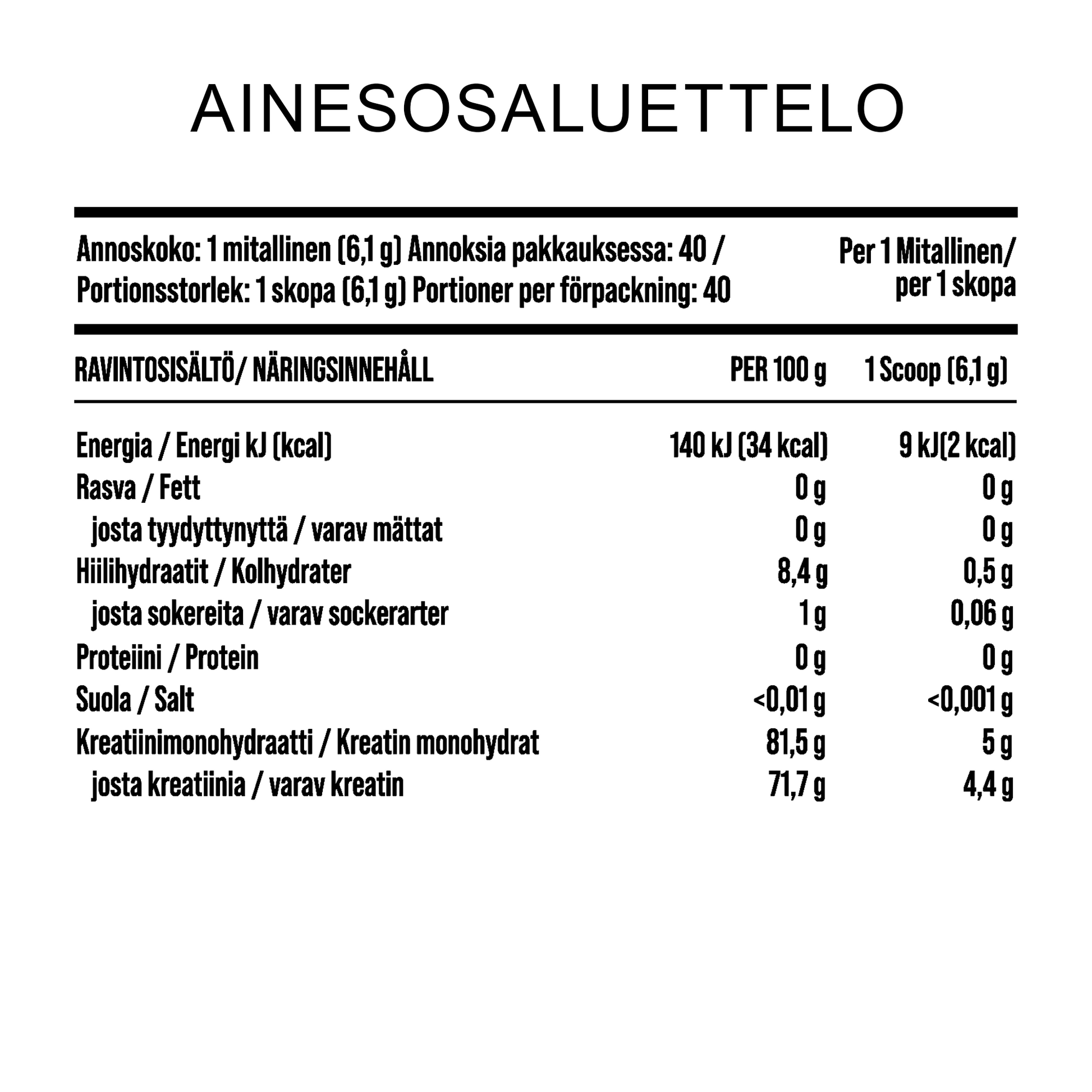 No fillers, no nonsense – Ei turhia lisäaineita. Ainoastaan puhdasta kreatiinimonohydraattia, kevyellä hiilihydraatti- ja sokerilisällä maun viimeistelyyn.