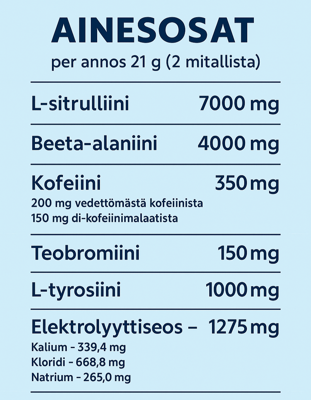 Käyttö: Sekoita 2 mitallista (yhteensä ~21 g) noin 4-6 dl kylmään veteen ja nauti 20–30 minuuttia ennen harjoittelua.