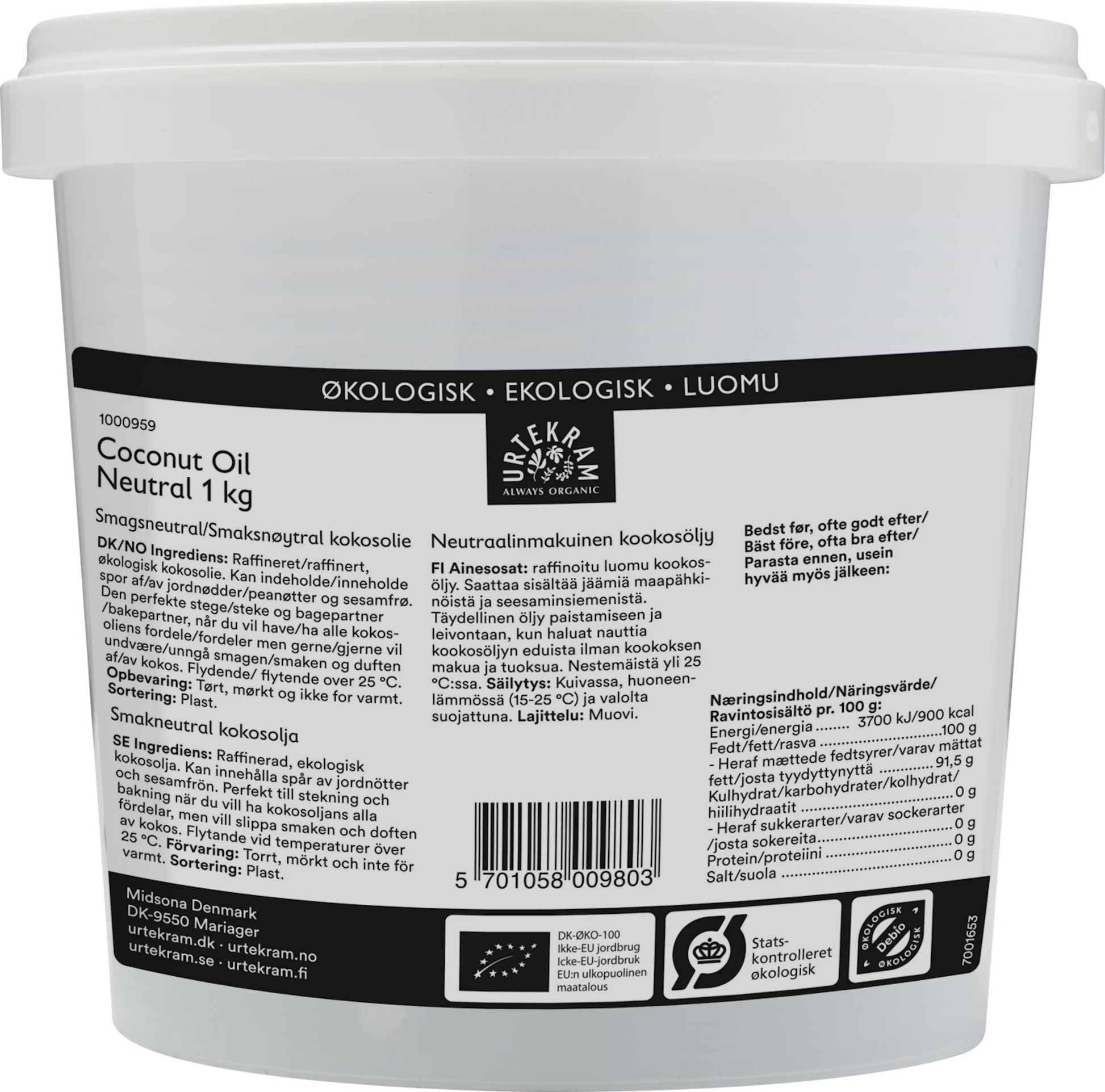 Urtekram neutraalinmakuinen kookosöljy 1kg luomu